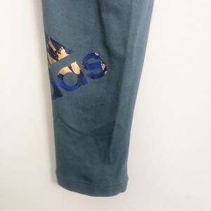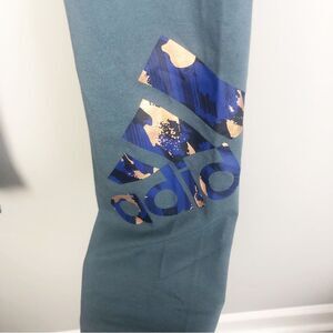 Cute powder blue leggings by Adidas. Midrise. Ankle full length. Logo on the leg in a camo style print - royal blue, metallic gold/bronze, and black. Great condition. No pilling. Womens size small.