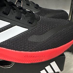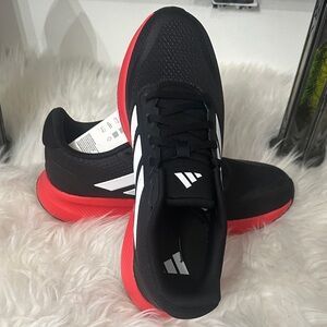 Sleek Adidas shoes with a black upper and bold red sole. Features signature white stripes.