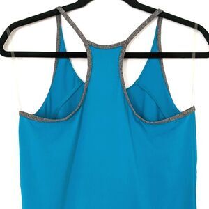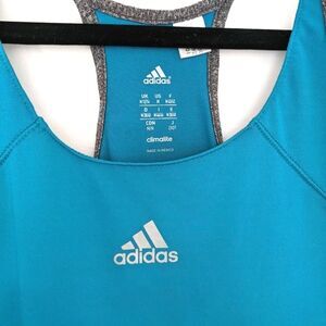 Stretchy, form fitting, racer back tank top made by Adidas in size Medium. Gently used, but in excellent condition. 84% polyester and 16% spandex. Gorgeous turquoise color with grey straps and grey trim across the upper back. Look stylish and stay cool during your workouts in this comfortable, moisture wicking tank top! Please feel free to ask any questions before purchasing! In GUC with no holes, snags, or stains. Bundle with other items from my closet for the best deal!
