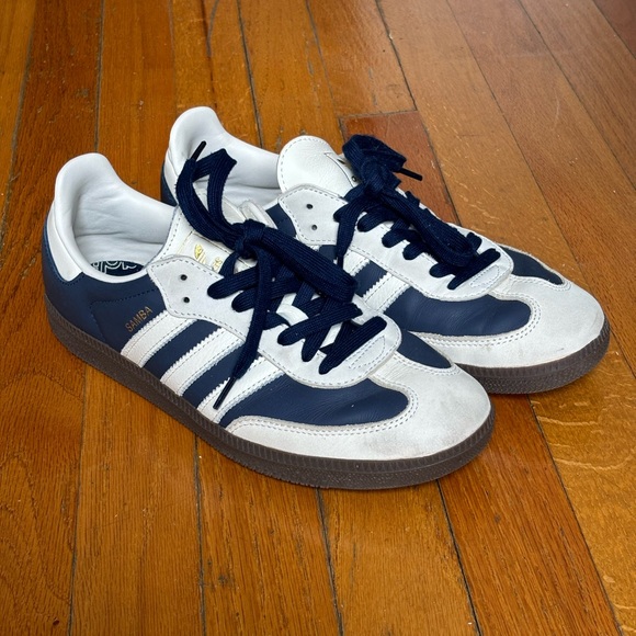 Navy & cream Adidas Sambas w/ dark brown sole. In good condition, minor creasing and scuffs (see photos).