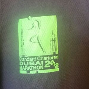 BLACK WITH GREEN COLOR COMBINATION SHORT SLEEVES CREW SHIRT. FRONT READS ' STANDARD CHARTERED DUBAI MARATHON 2012 . LABEL CAME OFF. 100 % COTTON. SIZE LARGE. SOLD AS SEEN.