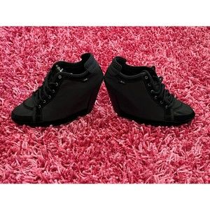 Never worn, size 6 black wedge sneakers by Adidas SLVR. Have been stored out of box so very minimal signs of storage wear as pictured and size marked on bottom of shoe - can possibly be removed.