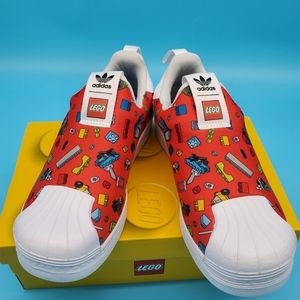 ADIDAD SUPERSTAR 360 X LEGO •Slip-on • Two- layer strech mesh upper • OrthLite@ sockliner •One piece EVA outsole with deep flex grooves •Upper contains a minimum of 50% recycle content • Color Cloud White/ Red Style # GX3286 Item pictures as is Usually shipped within 48 hours