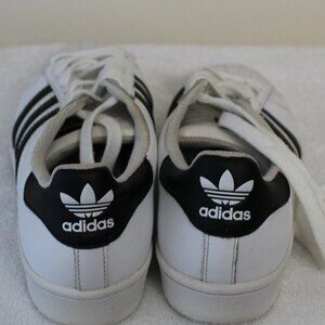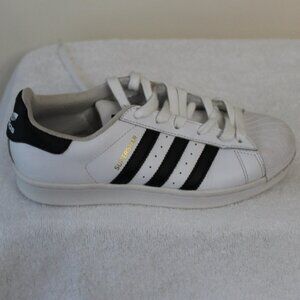 RHIS IS A PAIR OF UNISEX, ADIDAS SUPERSTAR, BLACK AND WHITE SNEAKERS IN A SIZE 4-1/2. THEY ARE DONE IN WHITE WITH BLACK STRIPES ON THE SIDES. THEY ARE IN BERY GOOD CONDITION.