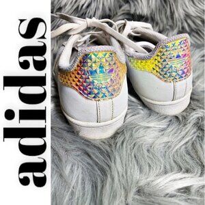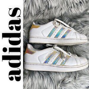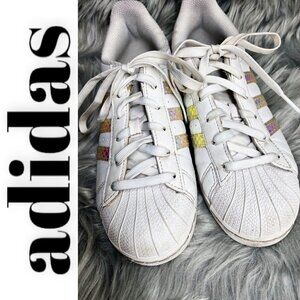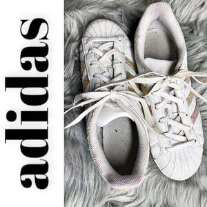 ADIDAS Superstar Sneakers In White Leather With Irridescent Gold Metallic Stripes and Heel Logo, Size 5.5.