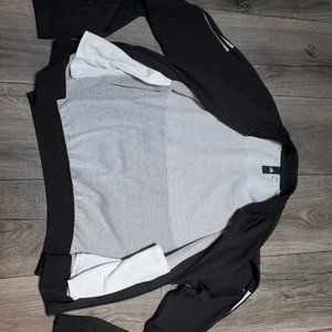 Adidas women's track jacket in black and white. Black jacket with three stripes down both sleeves in white. Double lined mesh material; black on outside and white mesh on inside. Lightweight. Zipper works great. Two zip pockets on the front, zippers work great on those also. Great condition!