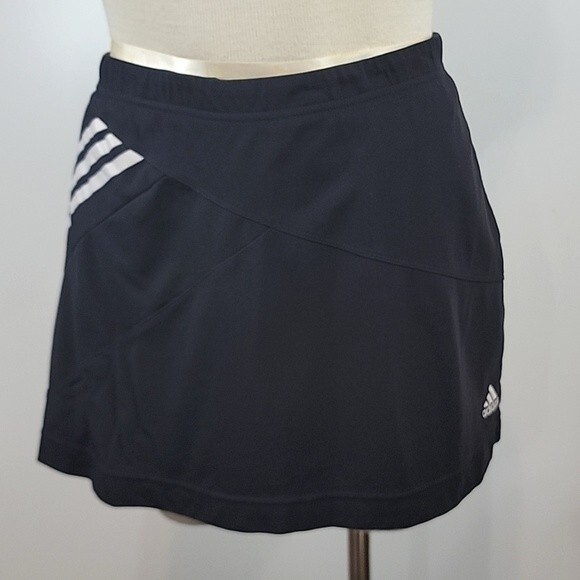 Pre-owned Adidas triple stripe tennis skirt/skort size large. Pull on style with stretchy waistband ans hidden inner pocket. Built in shorts underneath.