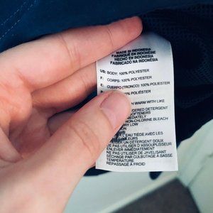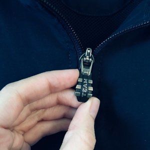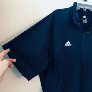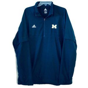 Navy blue color. Quarter zip front. No hood. Embroidered logos (Michigan in maize/yellow on left chest, adidas in white on right chest). Vented panels on front chest. Slight elastic on sleeve hems. Drawstring bottom hem. Mesh lined. Zippered front pockets. Side zipper on right for easy access to pockets in a layer underneath.