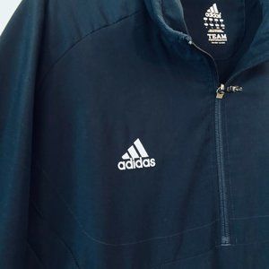 Navy blue color.  Quarter zip front.  No hood.  Embroidered logos (Michigan in maize/yellow on left chest, adidas in white on right chest).  Vented panels on front chest.  Slight elastic on sleeve hems.  Drawstring bottom hem.  Mesh lined.  Zippered front pockets.  Side zipper on right for easy access to pockets in a layer underneath.
