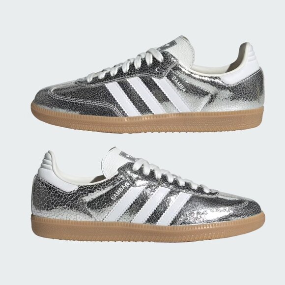 The Samba OG Shoes feature a cracked silver leather upper that catches the eye. The rubber outsole provides reliable traction, making them great for navigating city streets or making a statement at your next social gathering.