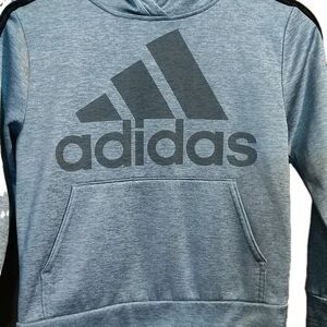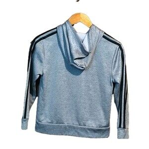 The product is a gray size 8 youth boys hoodie from the brand Adidas. This pullover hoodie features a hood and pockets, making it both functional and stylish for young boys. The neutral gray color allows for easy pairing with various outfits, while the Adidas branding adds a touch of sports-inspired style. Perfect for keeping boys comfortable and looking good during casual outings or sporting activities.
