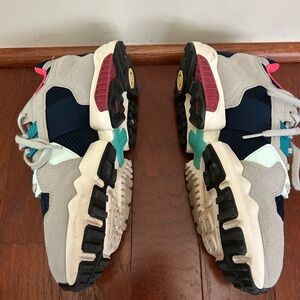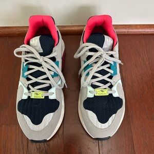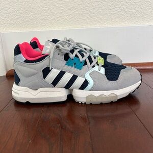 These Adidas ZX Torsion sneakers are women's size 8 in a stylish gray color with a multicolored design. They are athletic sneakers from the brand Adidas, known for their quality and comfort. The sneakers feature a modern and trendy style perfect for everyday wear or workouts.