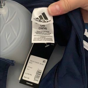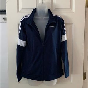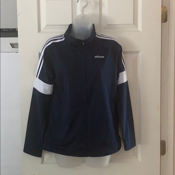 A long-sleeved navy blue zip-up track jacket featuring three white stripes along the shoulders and white bands around the upper arms; and "adidas" written in white lettering along the left chest. New with tags! Size: Large.