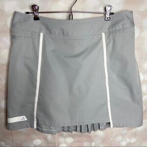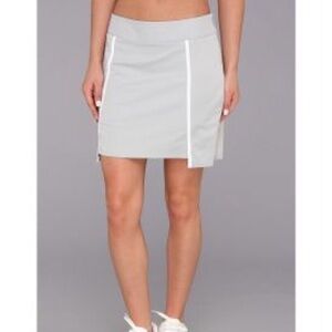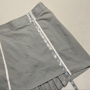 Great skort for an active lifestyle. Light gray with white piping. Center back pleat. Small rght hip slip pocket. Comfy mesh attached shorts. Side zip and hook closure. Excellent condition.