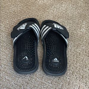 ADIDAS kids slip on sandals with Velcro. Great for on the go! Good condition! Lots of walking left to do in these sandals :)