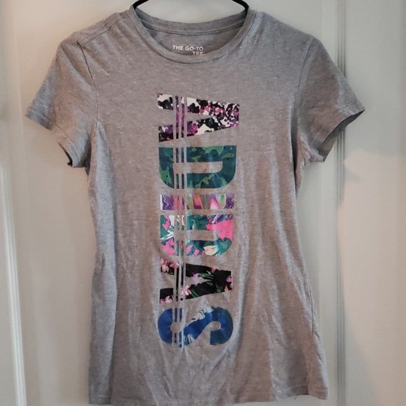 Gray, short sleeved, floral lettering