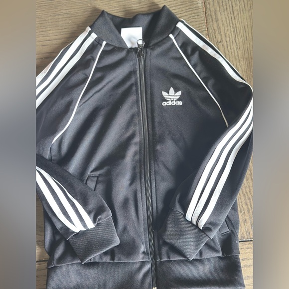 Black track jacket with white adidas logo & stripes down sleeves. Perfect for spring!