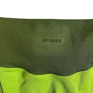 ADIDAS x IVY PARK Halls of Ivy 3-Stripes Knit Tights 2.0 in Semi Solar Slime/Wild Pine. Seamless. High Rise, elastic waist. Adidas & IVY PARK logo on bottom cuff. Appears to be a sample by the interior tag.
