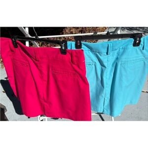 Vibrant deep pink and aqua and blue skorts with attached shorties.