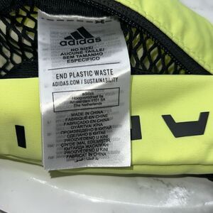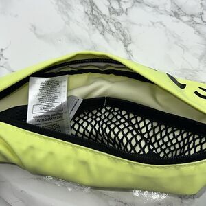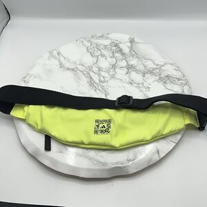 Neon yellow exterior with zip closure, black belt, lettering, logo, and zipper. Interior mesh pockets to help keep the essentials secure. Adjustable clip belt. Excellent condition. Measures 12” x 3.5”.