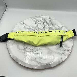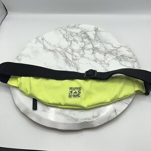 Neon yellow exterior with zip closure, black belt, lettering, logo, and zipper. Interior mesh pockets to help keep the essentials secure. Adjustable clip belt. Excellent condition. Measures 12” x 3.5”.
