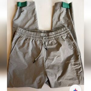 Teal bungee pulls on waist and velcro to tighten ankles along with Adidas' Classic Trefoil accents all around