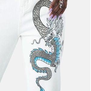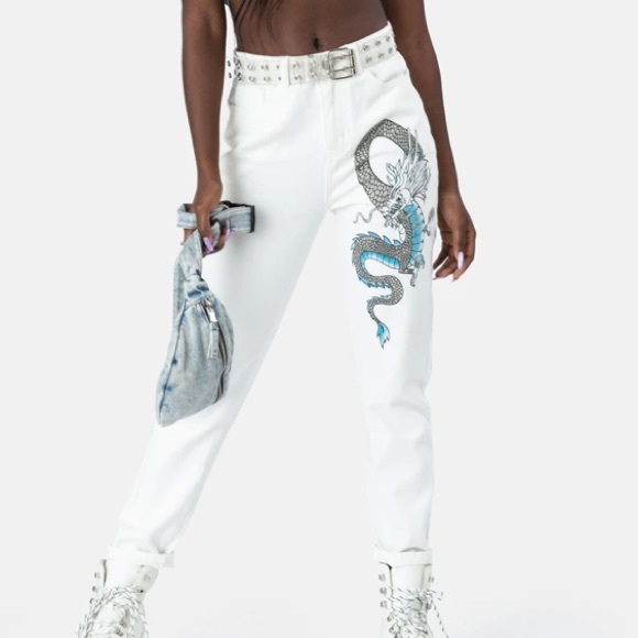 white wash mom jean dragon detail would fit a size 0/00 i’m size 2/4 and they were too small but i absolutely love the style of them