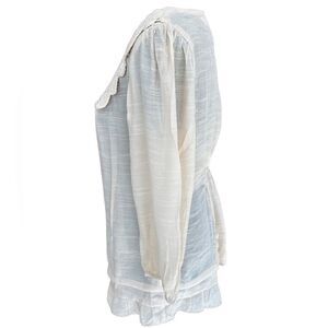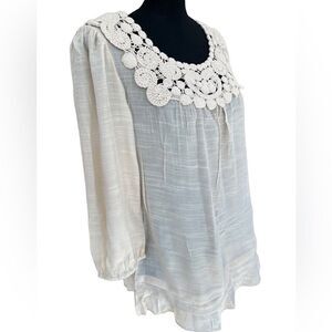 ADIVA ivory top with cotton crochet bodice details, size S. Rayon and polyester blend, round neck with crochet accents. Long sleeves with elastic, soft ruffle bottom, smocked gathering in back as shown. Approximate measurements are pit to pit 20”, length from shoulder approximately 25”.