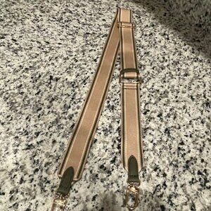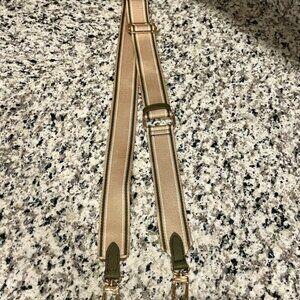 Upgrade your accessory collection with this chic Adjustable Webbing Strap by Anne Klein, perfect for adding a touch of sophistication to any bag. Crafted with a stylish combination of durable canvas and luxurious leather accents, this strap is designed to last. The eye-catching khaki and military green color palette is complemented by elegant gold hardware, creating a versatile and trendy look. New not tags The adjustable length ensures a personalized fit, making it a functional and fashionable addition to your ensemble. Ideal for everyday use or travel, this strap offers both comfort and style. Elevate your handbag game with this must-have accessory from Anne Klein.