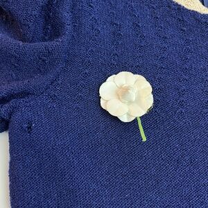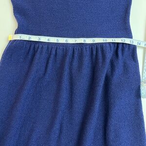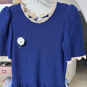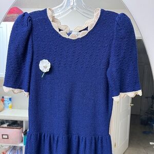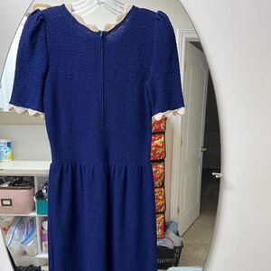 Vintage Adolfo Knit Dress in blue color with white lace outlining the dress , size not marked but the fit is close to small size, measurements are shown in pictures, there is small tear right sleeve as pointed out in picture , otherwise in good condition , from smoke free home