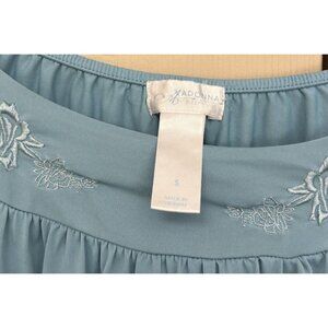 The ADONNA Vintage 90s Embroidered Nylon Short Sleeve Night Gown is a classic and feminine piece that embodies the style of the 90s. Made of lightweight nylon fabric, this gown features a solid blue color with intricate small flower, lace, and embroidered accents. It has a scoop neckline and a pull-on closure for easy wear. The gown is machine washable and designed for a regular size small fit. Perfect for all seasons, this vintage chemise from Adonna is a timeless addition to any woman's sleepwear collection.