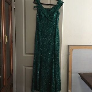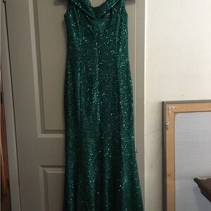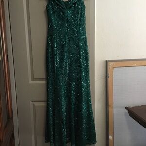 Elegant emerald gown with sparkling sequins. Perfect for glamorous occasions.