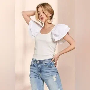 The layered ruffled sleeve ribbed top is a chic and feminine piece that adds a touch of elegance to your outfit. The layered ruffled sleeves create a stylish and sophisticated look, while the ribbed fabric adds texture and dimension. This top is perfect for dressing up a casual outfit or adding a touch of flair to your everyday look.