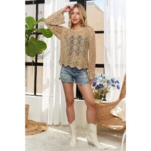 ADORA Long Sleeves Round Neck Scallop Edge Relaxed Fit Crochet Top | Natural