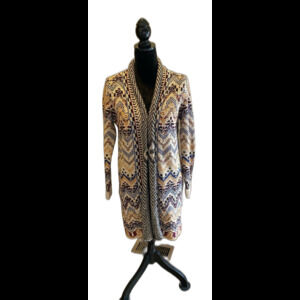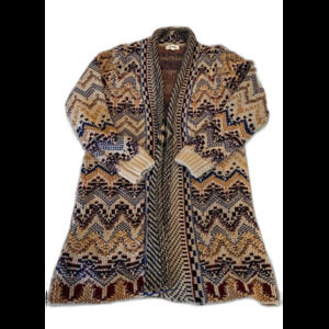Open-front duster style with a distinctive Southwest/tribal pattern in multiple colors.