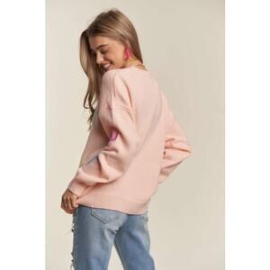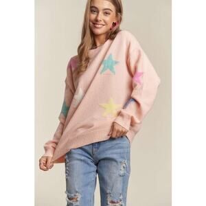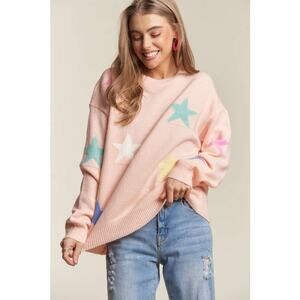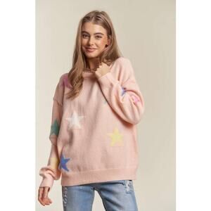 ADORA Star Pattern Crew Neck Drop Shoulder Long Sleeves Ribbed Sweater | Blush
