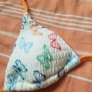 🦋White and Multi-color Butterfly, ruched bikini top with Orange trim.