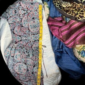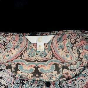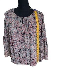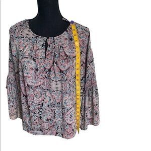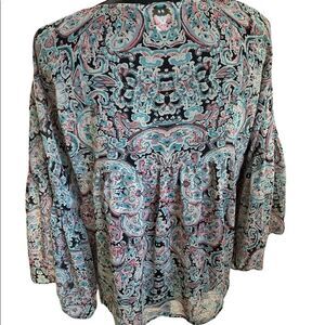 ADORABLE Dress Barn cold shoulder poet sleeve semi sheer blouse. These pics don’t show how cute this blouse is- there’s a flirty tie on each sleeve where the slit comes together, and a slight cold shoulder- not a gaping, fall wide open style. Bracelet length sleeves, size medium