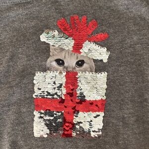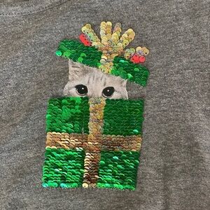 Cute and festive outfit for the holidays or Christmas! A long sleeve shirt with a tie front and a cute kitten, peeking out of a gift-wrapped box decorated with flip sequins - silver and red on one side, and gold and green on the other. And beautiful stretchy, comfy Christmas red leggings that are made of 70% cotton, 29% polyester and 1% spandex.