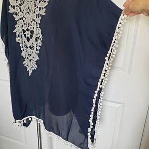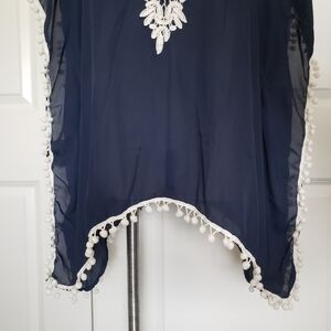ADREAMLY Navy White Pom Trim Swim Cover Short Caftan M