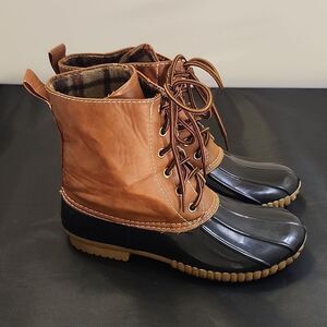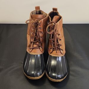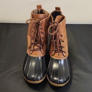 ADRIANA WOMEN'S MAPLEWOOD WATERPROOF BOOT SIZE 7 COLOR BROWN &BLACK Rainboots so cute, you'll want to wear these even on the lightest drizzle days.This waterproof duck boot features a 100% synthetic upper and a rubber sole for durability. It has a contoured EVA footbed for added comfort and is designed to be spot cleaned only.THIS ITEMS IS PRE-OWNED EXCELLENT CONDITION WITH ONLY LIGHT SIGNS OF WEAR IF ANY CHECK THE PICTURES (FYI ONE OF THE BOOT HAVE A SMALL TINY DAMAGE IN THE BACK CHECK THE PICTURES)