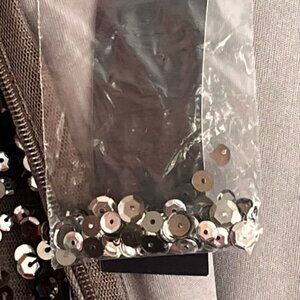 This is a beautiful short sleeved gown. It is fitted and a smoky grey color. It sparkles with sequins. Very elegant. Perfect for a wedding, banquet or dress up night on a cruise.