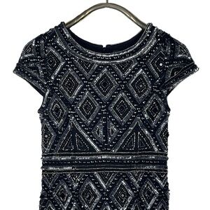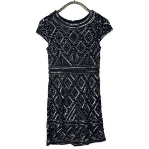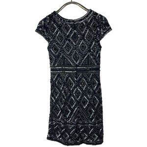 ADRIANNA PAPELL BEADED SEQUIN DIAMOND GEOMETRIC CAP SLEEVE SHEATH COCKTAIL DRESS