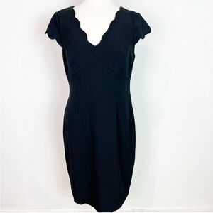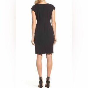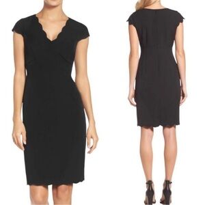 Adrianna PAPELL black scalloped v-neckline cap sleeve dress. Scalloped crepe sheath dress. Perfect black dress for any occasion. Cocktail or career