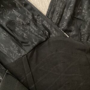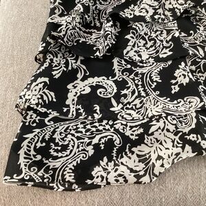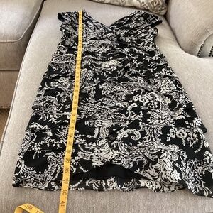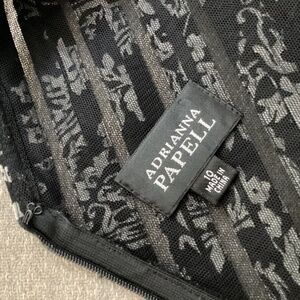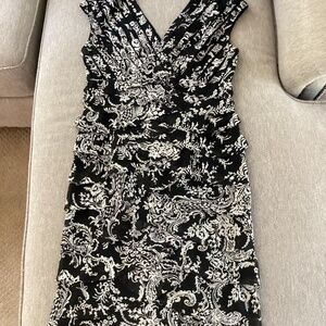 This super figure flattering Adrianna Papell dress is appropriate for any occasion! It is a women's size 10 and like new condition! It does have some stretch. The dress features a small cap sleeve, V neck and V in back. There is a full zipper with hook and eye in the back. Flirty ruffle bottom and lined. Some sheer spaces in between on the bodice, see photos.The print is a damask done in classic black with white print. A classic flattering style and comfortable fit Adrianna Papell dress.