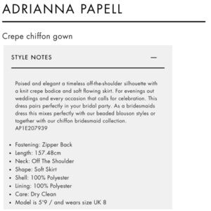 DETAIL: OFF THE SHOULDER. CHIFFON SKIRT. FITTED CREPE KNIT BODICE. ZIPPER DOWN BACK. LINED. NO SLIP STRIP.