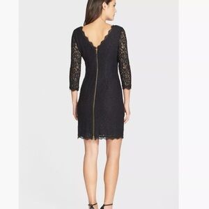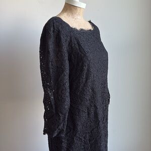 This elegant black lace dress features a sophisticated design with three-quarter sleeves and a flattering silhouette.