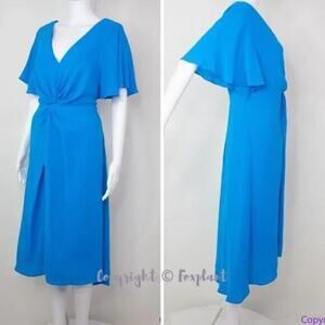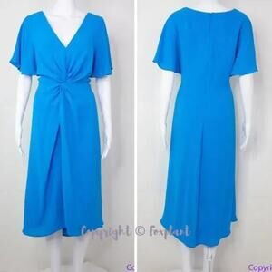 ADRIANNA PAPELL Womens Blue Twist Front Zippered High-low Flutter Sleeve V Neck Below The Knee Cocktail Dress, size 14