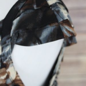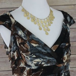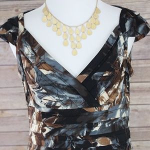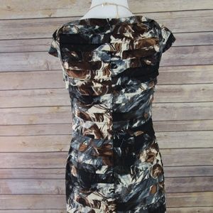 ADRIANNA PAPELL Gray, Brown, White, and Black Camouflage Print Pleated Cap Sleeve V-Neck Women's Sheath Dress, Size 10. This elegant and sophisticated fully-lined dress has a beautiful gray, brown, white, and black camouflage print design pattern, pleated detail element, cap sleeves, wrap-front, and a hidden back zipper closure. The material is 95% Polyester and 5% Spandex. The approximate measurements are as follows: Length = 37" (Shoulder to Hem), Bust = 38", Waist = 34", and Hips = 38".