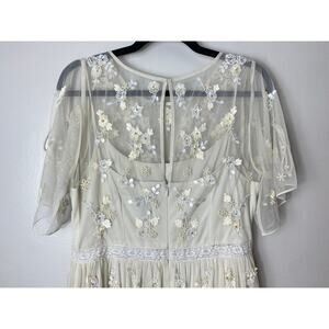 ADRIANNA PAPELL DRESS 14 SEQUIN BEADED FLORAL SHEER MESH FLUTTER IVORY BEIGE PEARL WHIMSICAL ELEGANT FAIRY BRIDAL BRIDE 3D FLOWER APPLIQUE CUTE CHIC FEMININE ETHERIAL